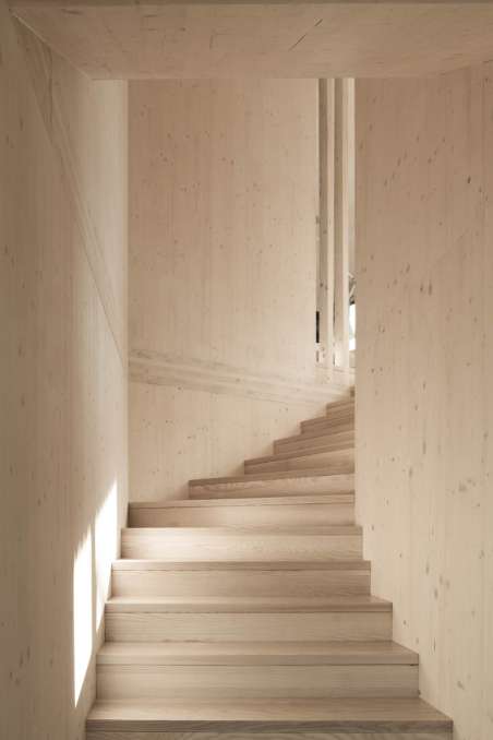 Bereitet dem Baustoff Holz die perfekte Bühne: Der Grundriss ein Stern, der Kubus ein Himmelswerk. Lichtachsen, Spiegelfronten und warme Haptik setzen den außergewöhnlichen Bürobau sinnlich in Szene. Abseits der Norm und jenseits von Beliebigkeit – so geht große Handwerkskunst!