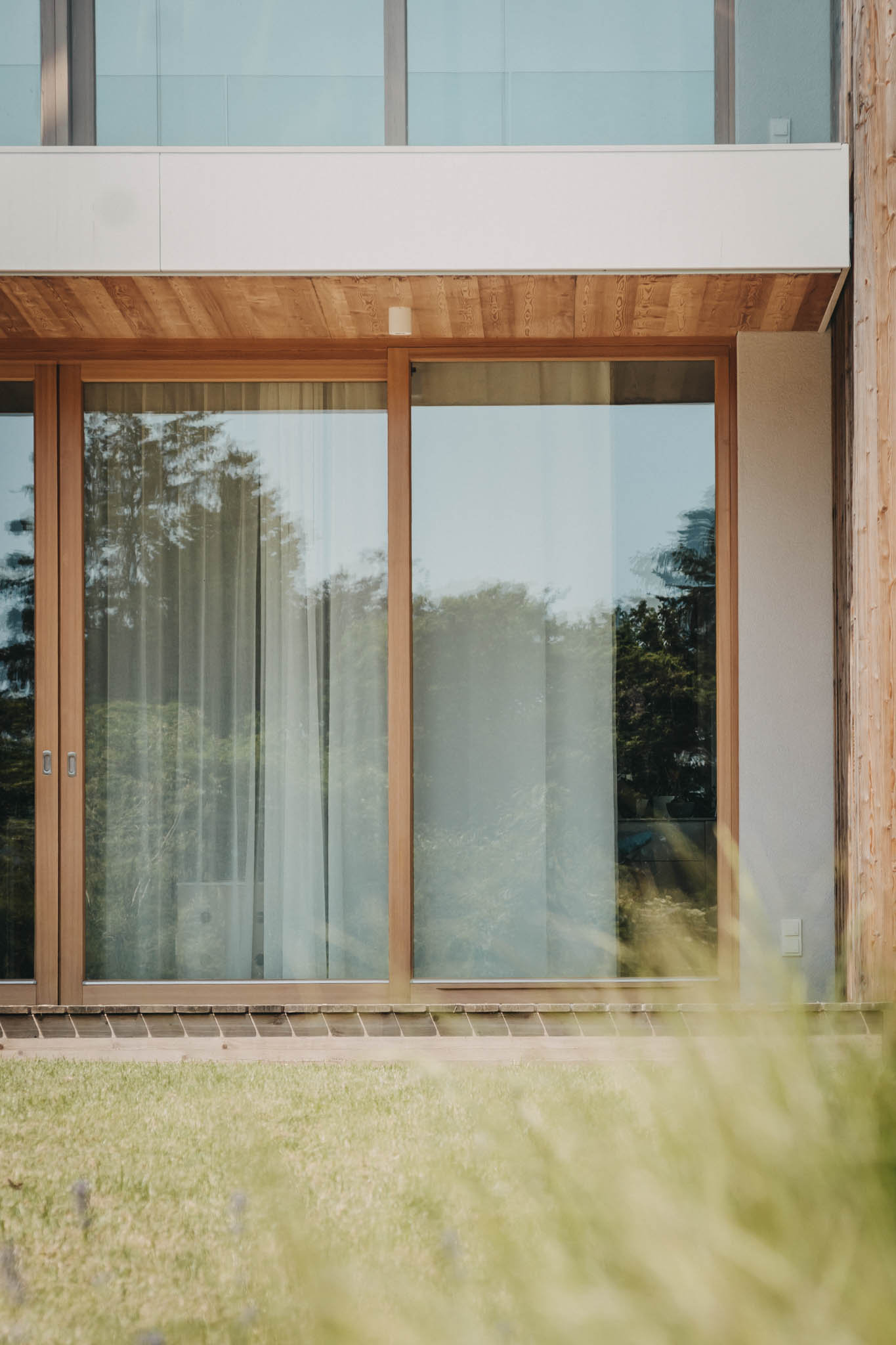 Eine klassische Gebäudeform planen und dennoch die Einzigartigkeit bedienen? Entstanden ist ein Eigenheim mit zwei Gesichtern, ein gekonntes Zusammenspiel von weißer Putzfassade und viel Lärche. Einschnitte in die Kubatur lesen sich wie architektonische Apfelbisse, die mit Holz und Lamellen gefüllt ihre ganz eigene Qualität erhalten. Das Ziegelmassivhaus mimt straßenseitig mit spitzem Dachgiebel solide Bescheidenheit, die Gartenseite dreht hingegen mit Transparenz und Offenheit gehörig auf. Hier gewährt eine durchgängige, teils verspiegelte Glasfassade spannende Ein- und Aussichten. Nachts erwacht sie zu besonderer Lebendigkeit und wirkt wie der Querschnitt eines illuminierten Puppenhauses. Ein Zaungast hätte nun freien Blick auf das luftig gestaltete Innenraumdesign – vom ineinanderfließenden Ess- und Wohnbereich mit viel Weiß und warmem Holz, bis hinauf in das elterliche Schlafzimmer und dem hellen Marmorbad mit freistehender Badewanne. Wie gut, dass es hier kaum Nachbarn gibt!